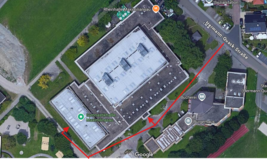 Wichtiger Hinweis: Zum Betreten der Rheinhalle bitte an unserer Klingel am Seiteneingang (Richtung Schulhof) klingeln; für die Gymnastikhalle an deren Seiteneingang ("Geheimtür" Richtung Kindergarten).